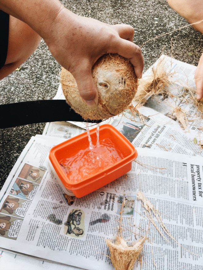 If you’re like Grandpa or Grandma, you can tell which of the eyes is the weakest, in which case, you get a screwdriver and poke it and drain the coconut with very little spillage. If you’re like the rest of us, you skip that part and go straight to the whacking. Let out an “ahhh!” while you do it for effect. Plus, it just feels like the right thing to do.