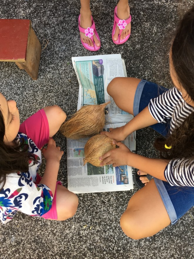 Before she got started, she recalled that Grandpa used to hold the coconut in one hand and whack it with a machete with the other hand, the way you take a nut out of an avocado. Oh my word. I remember his efficiency, but I don’t remember that specifically. Recommended for experienced coconut crackers only!