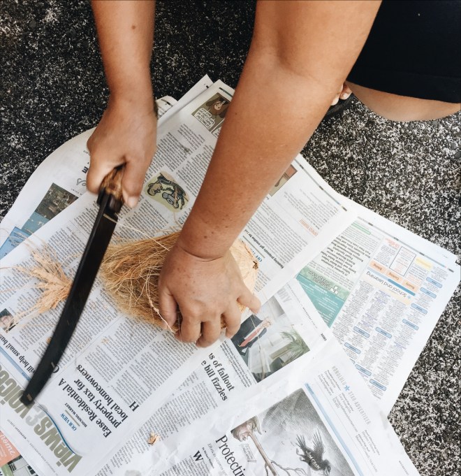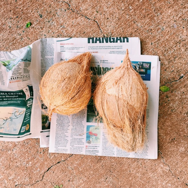 First, pick your coconuts. This is a key step. The best ones are somewhere between young and mature. How to know which is which? Zero idea. But who cares when you can just ask the man at Tamashiro Market to pick some out for you. Next, go outside. Could you do this in your kitchen? Sure, but why create extra work. Place the coconut on a newspaper for quick clean-up.