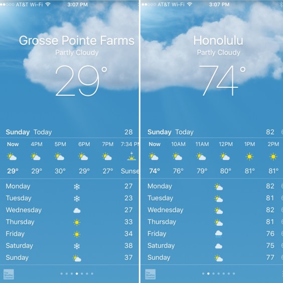12) When we drove to the airport on our way to Hawaii, it was snowing. So wonderful to go from that to seeing sun every day, not to mention family and friends.
