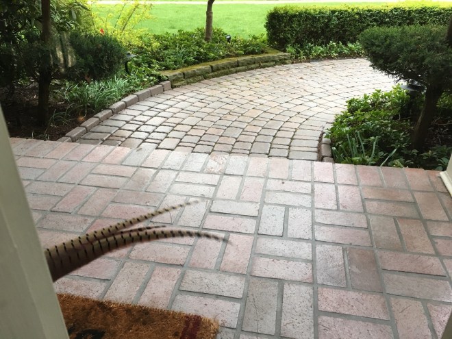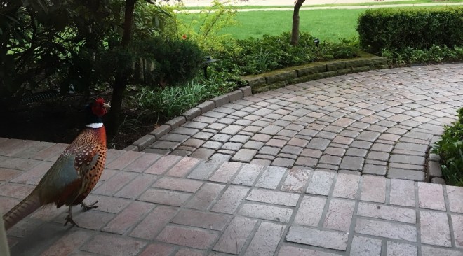 7) Our neighborhood pheasant is back, meaning he’s come out of whatever hiding place he uses over the winter. Many mornings over the last two weeks, he has woken me up around 6:30am with his peck-peck-pecking at our front door’s brass kick plate. I did finally get a good shot of him, though, strutting away from the door, after presumably being frightened away by my shadow.
