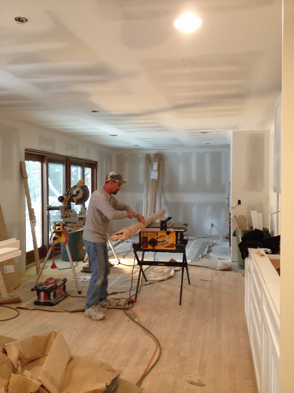 The wall between the family room and kitchen was taken out and the light fixtures were replaced. New hardwood flooring was put down throughout both rooms and stained. New drywall, baseboards and molding. Sliding doors were sanded and painted.