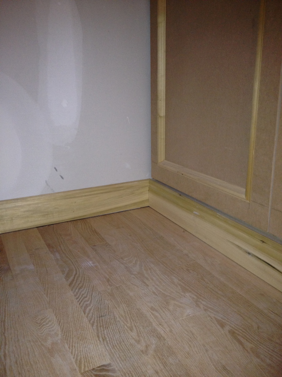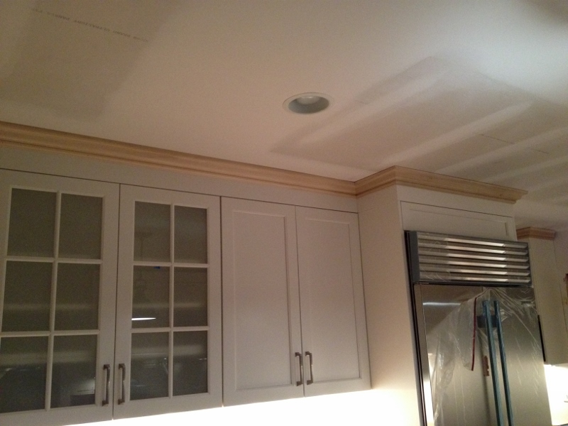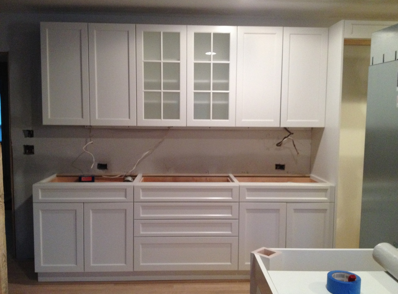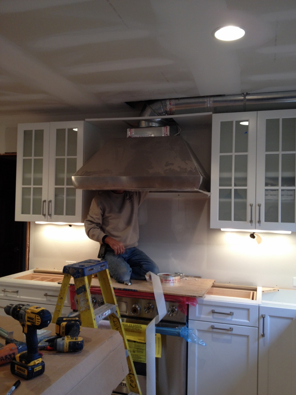 Peninsula with induction range was removed and an island was put in lengthwise. New everything. Cabinets, appliances, backsplash, molding, baseboard, lighting and paint. Kitchen window was moved eight inches to the right in order to maximize the corner space. Shoe molding was stained to match the floors and installed around the perimeter of the room and the island.
