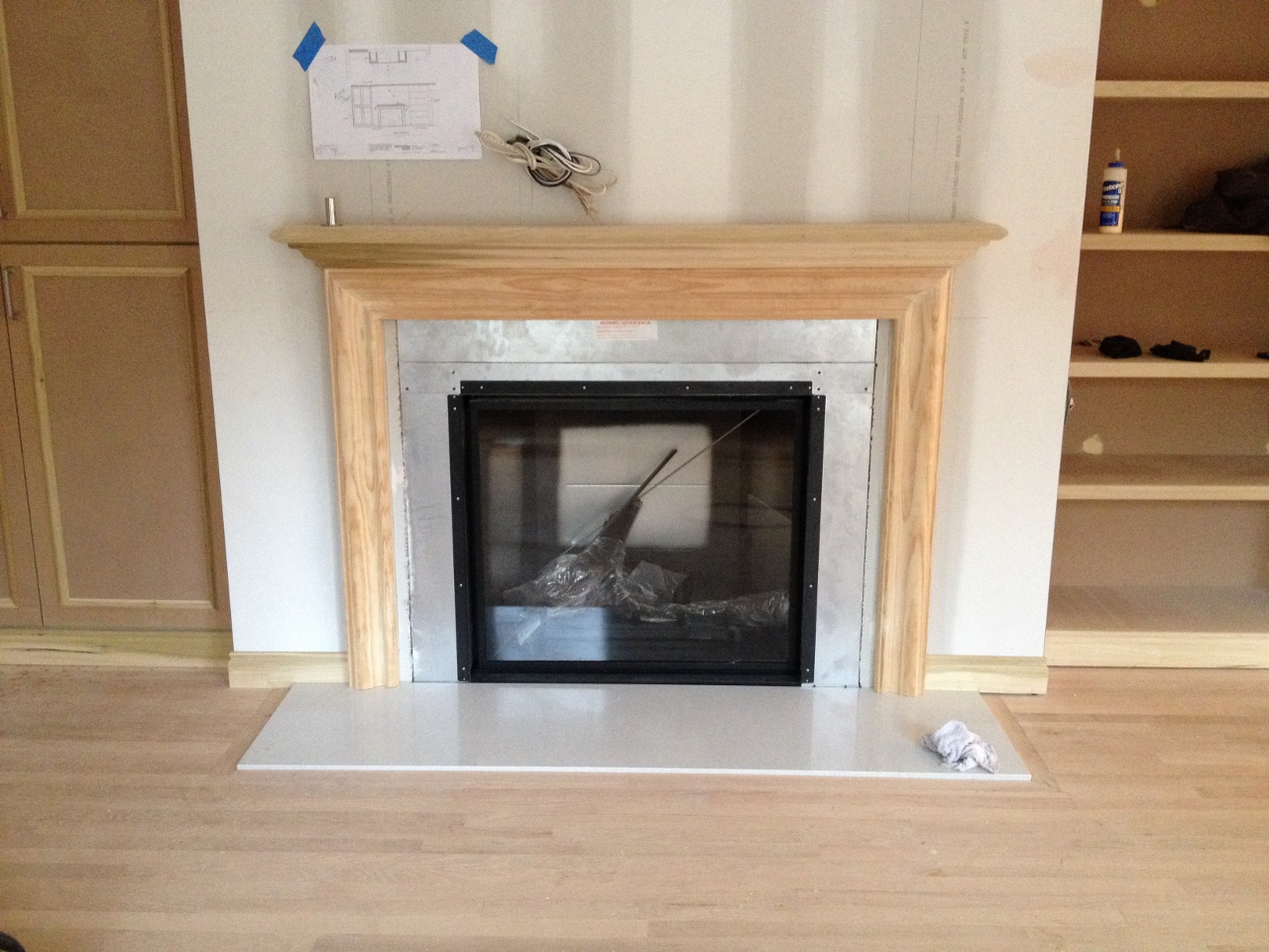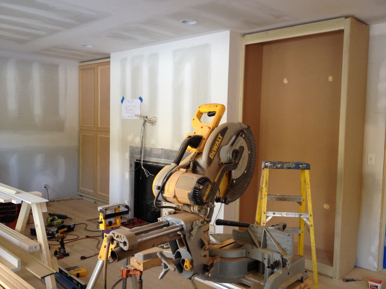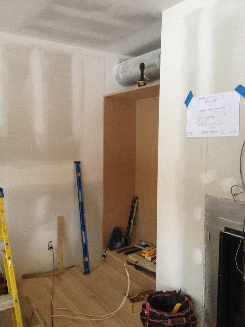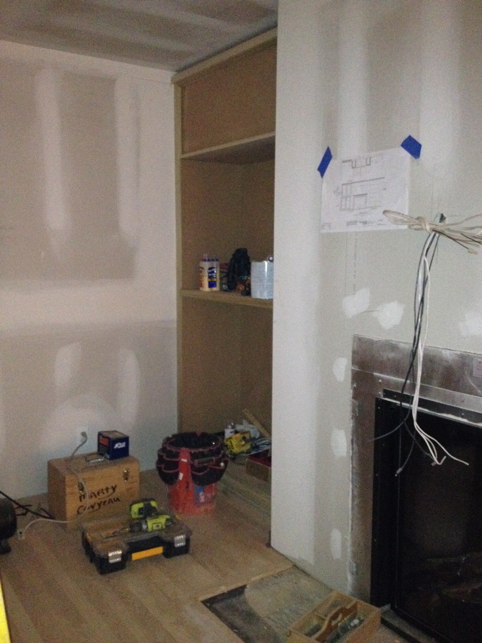 The marble tile around the fireplace was taken down. The old fireplace was covered up and a new gas fireplace was installed, with built-ins flanking the sides (the closed cabinet on the left hides the flue).
