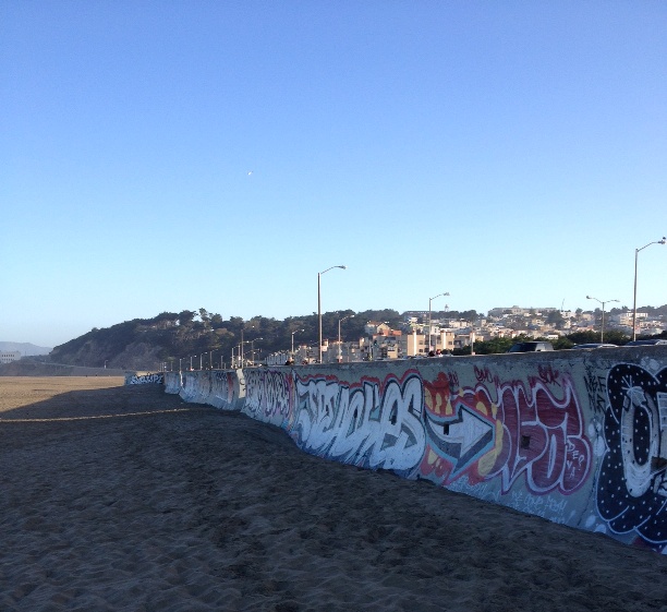 Ocean Beach is not initially beautiful. At least it wasn’t to me, the girl who grew up in Hawaii. There’s a huge, graffiti-covered (only on one side, thankfully) concrete wall that spans the entire length of the beach. It’s supposed to keep sand dunes from piling up on the Great Highway. Still, every summer the highway shuts down for the annual sand removal, a project that moves approximately 7,000 to 10,000 cubic yards of sand (source: SFGate).
