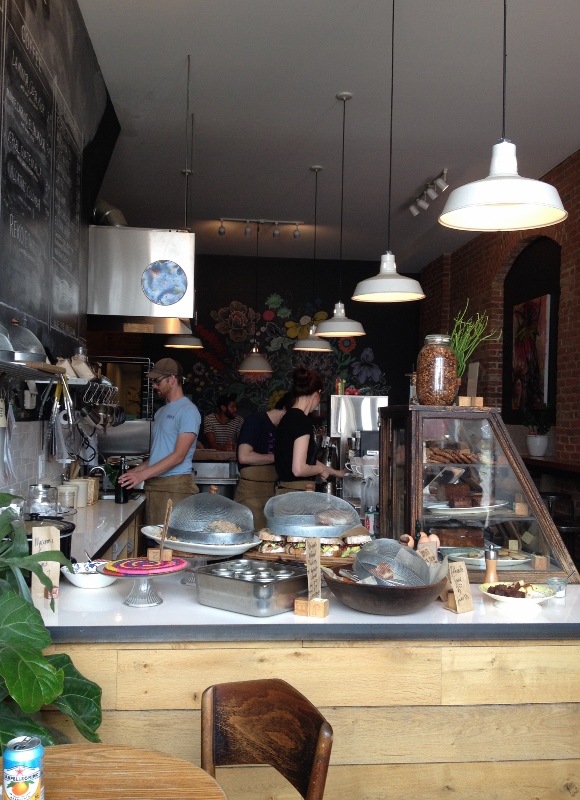 The clientele was what one would expect. There was the usual one or two people on laptops at the back communal table, a couple regulars at the bar area, a few business folks ordering cups to go. I sat at the counter facing the street. The guy behind me was talking to a friend about such and such picking up his new TV show (yawn) and the older couple next to them were tourists (I’m guessing. They were speaking French).