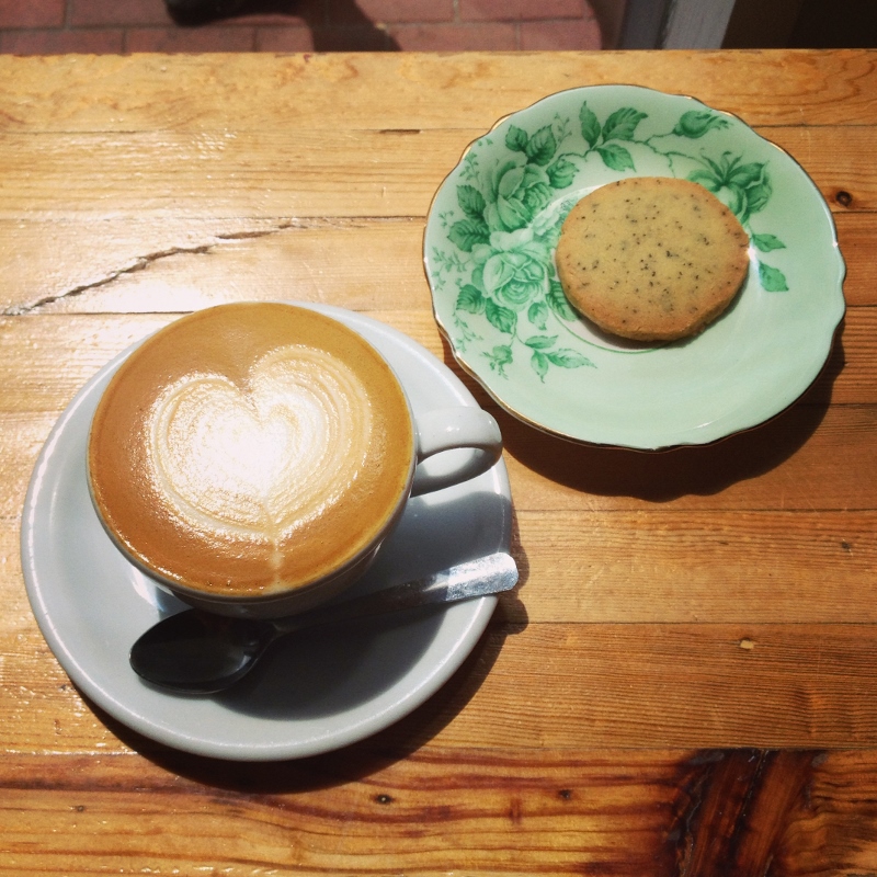 So what about the coffee? you ask. Delicious! It was full-bodied, and bitter the right way. The crema was thick and creamy and I can’t remember, but I don’t think I needed sugar. The cookie was served on a pretty little vintage plate. It was quite sweet and the sage tasted suspiciously like rosemary, but hey. I was there for the coffee.