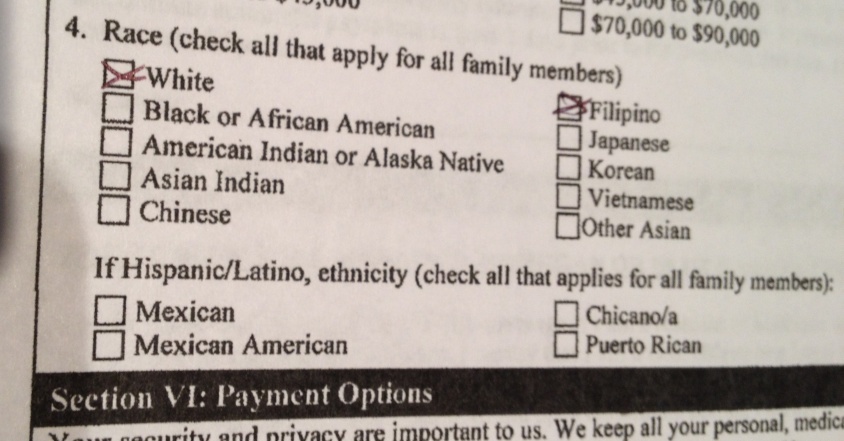 All these statistics reminded me of the various forms I had to fill out growing up. There was never a box for “Filipino.” Sometimes the form (aka stupid form) would say, “please check only one box.” Okay. I’m half Filipino, half White. Seriously? (And you guys, I even remember forms that asked for “Color”! omg). I’d look at the “White” box and then the “Asian” box and then the “Pacific Islander” box and eventually (and out of frustration) I would just check “White.” This especially bothered me when I started applying for college. “What about me?!?,” I would yell silently at the forms. Last week I got a pleasant surprise while filling out new health insurance applications for the girls. Finally, someone got a clue; the form listed many ethnicity options, including “Filipino.”