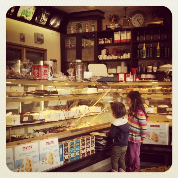 The girls chose a smiley face sugar cookie and a sugar cookie dipped in chocolate and filled with jam. I opted for the almond croissant, telling myself to enjoy it, even if it wasn’t La Boulange. I was thrilled to spot their espresso machine and ordered a cappuccino. It was perfect – success! And the croissant. Delicious. It was flaky and buttery, and the filling had just enough almond flavor not to be overwhelming (and not too sweet, either). It wasn’t La Boulange, it was better. I was so happy, I started chatting with the woman about San Francisco, coffee, the kids (normally you couldn’t pay me to talk to a stranger. Not even a nice one).