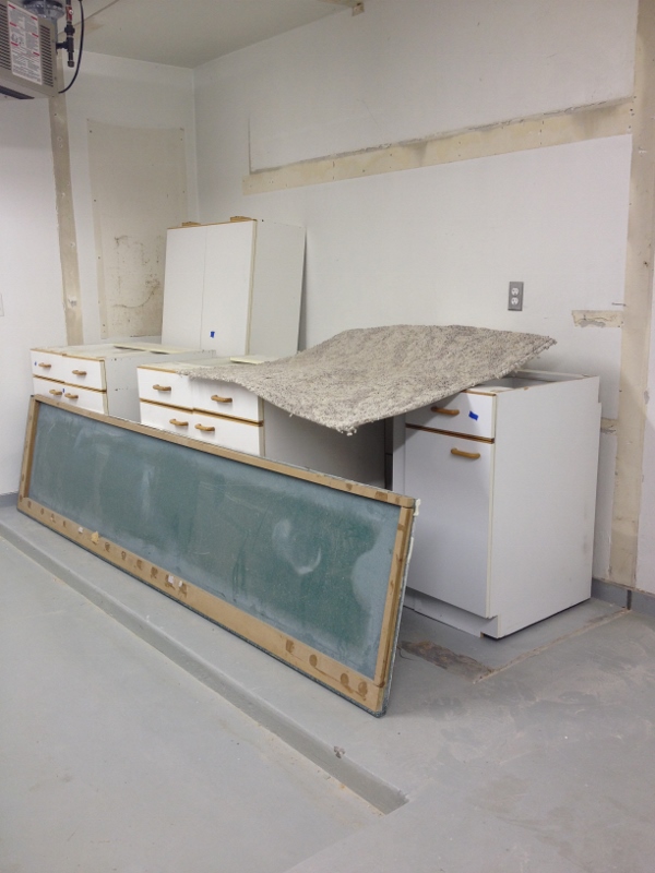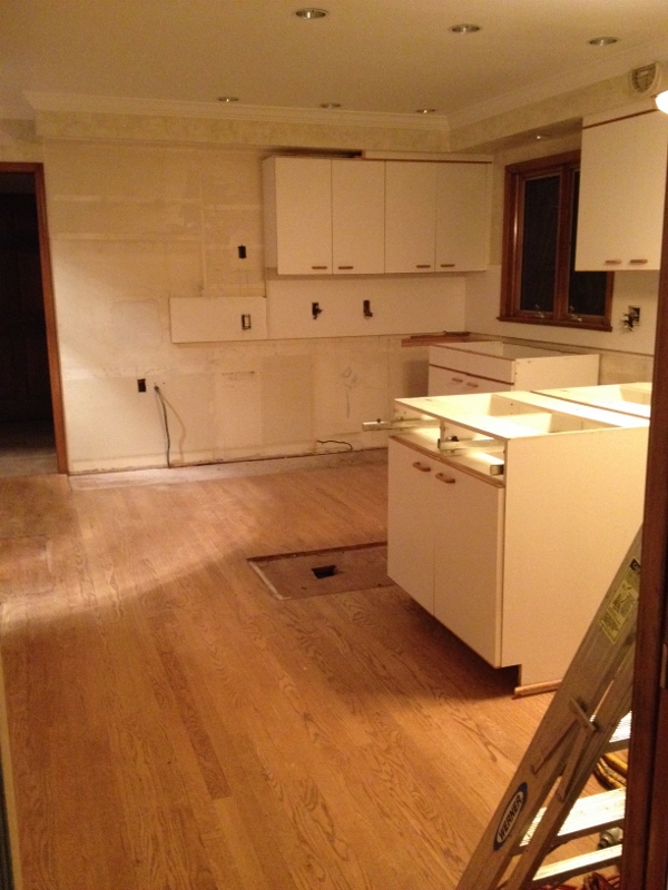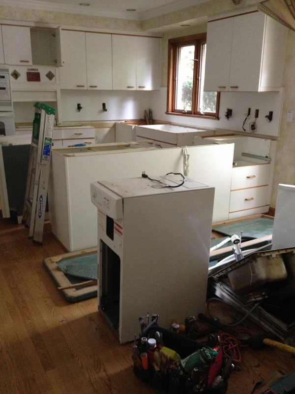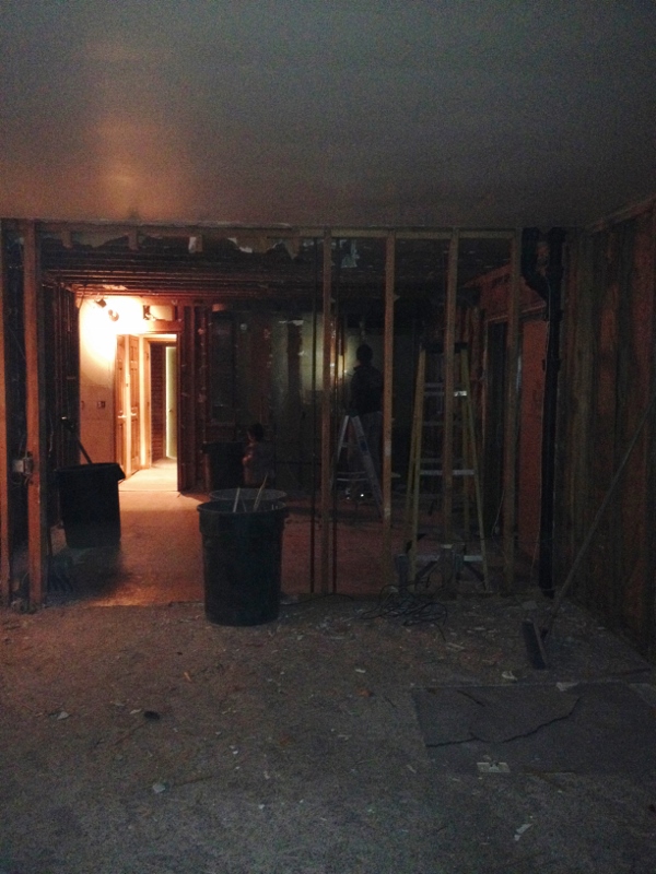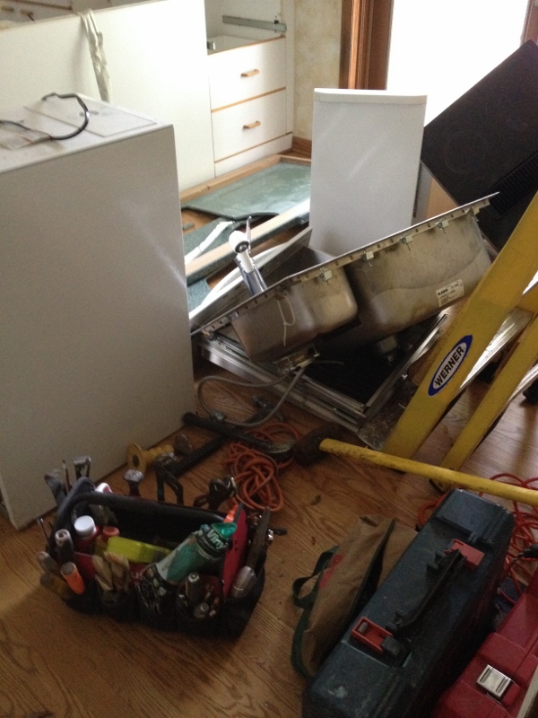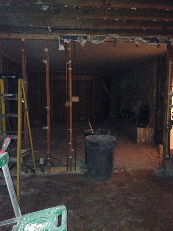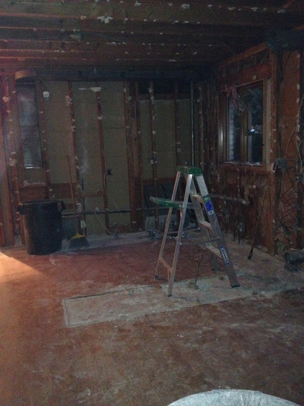 The demolition crew finished up last Saturday (the 25th). Week two consisted of electrical work, plumbing, building the fireplace wall and installing the fireplace, installing the vent in the kitchen (above the stovetop/range), relocating the central vacuum vent/pipe and moving the kitchen window.