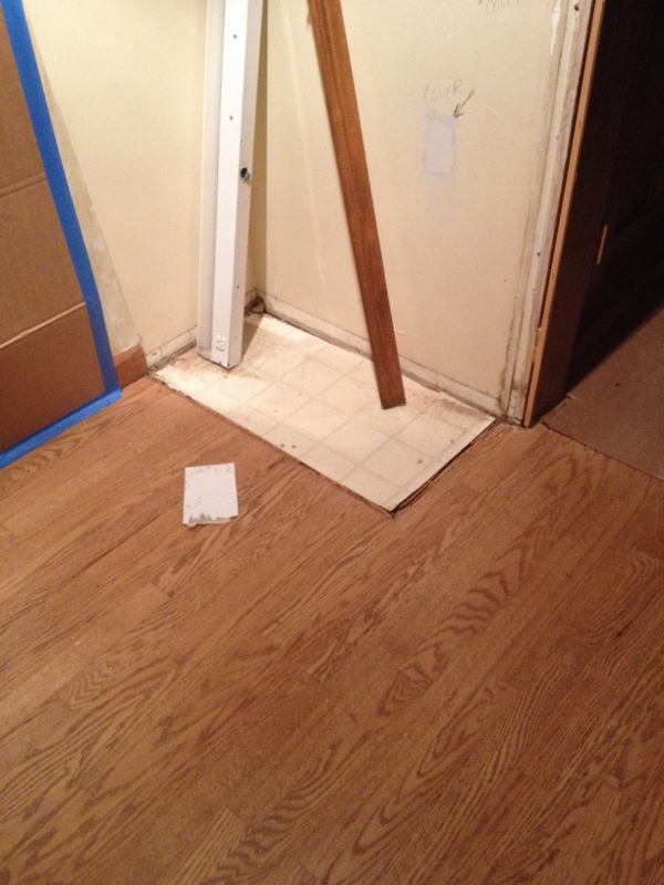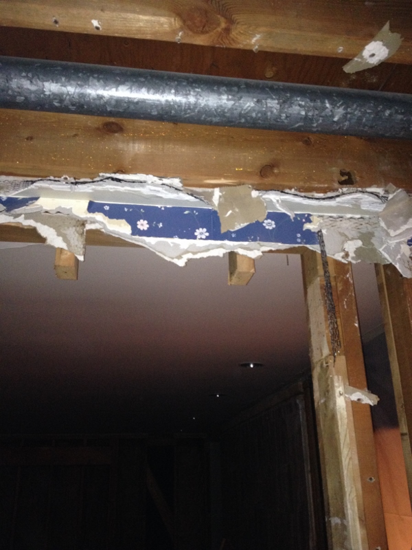 The waterlines in the wall we knocked down were relocated (blue and red) and the central vacuum vent (that gray pipe sticking up) was moved (below pic) to the far wall that adjoins the family room and kitchen.
