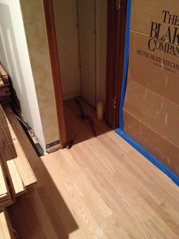 IMG_8920 (600x800)Then he installed 2 1/4″ wide red oak floors. The floors will get stained and sanded last, after everything else (cabinets, moldings, lights) is complete.