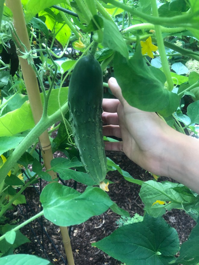 3) We have cucumbers – woo-hoo! I never know what’s going to grow in our backyard. Sometimes things work, but mostly they don’t, because don’t get a whole lot of sun back there. We have a small patch of space where the sun lingers, and that’s where we planted the cucumbers. We also planted tomatoes and we do have some of those, but the fruit has been on the vine for week and weeks and they are all still green.