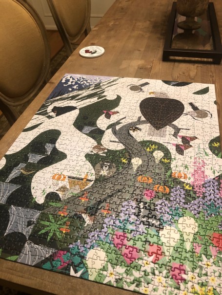 The second one I brought back from my Dad’s. It also had a missing piece, which was surprising, because usually he labels the box with “missing piece!” if that’s the case. If you wondered where I got my puzzle penchant from, when we arrived at my Dad’s, he had three large boxes filled with 30+ puzzles, all of which they were going to donate after I looked through and decided which ones I wanted to keep.