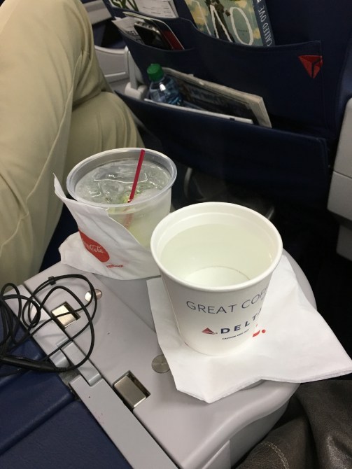 1) We took a really early flight (woke up at 5:30am), which was harsh, but once we got going, not too bad. Plus, thanks to Delta miles, we flew first class. As soon as we got on the plane, my husband ordered a vodka soda because 1. adult weekend 2. rockstar. That’s my plain hot water next to his big boy drink.