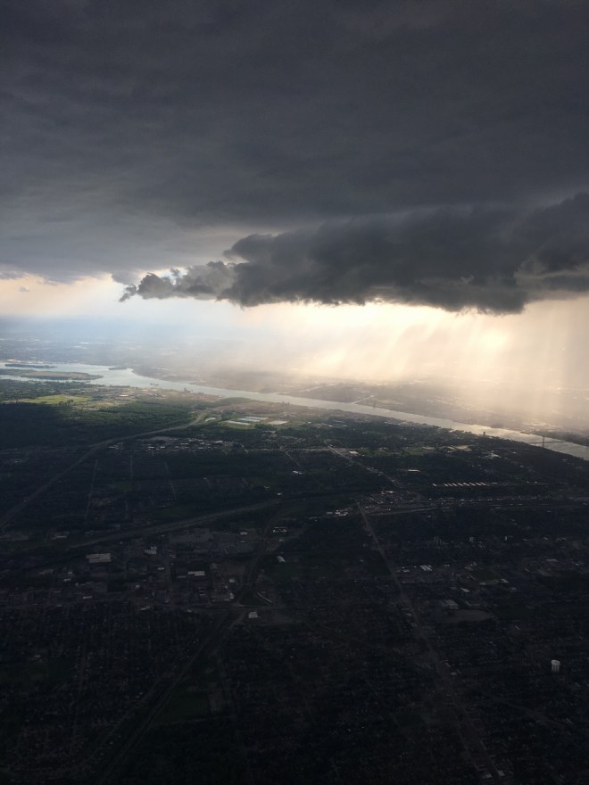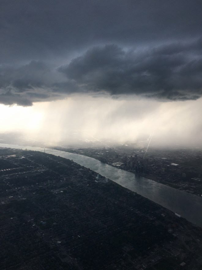 I know stuff like this happens all the time and of course it was the pilot being safe and not landing in a storm, but still. The only saving grace (besides the fact that we landed with our lives intact) was the phenomenal view of the storm over downtown Detroit. Photos do not capture the powerful beauty of that view. I had to muster all my inner strength to bend down and fish around for my camera and snap a pic. All the while, digging my nails into my husband’s arm.
